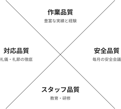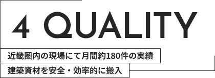 どの現場においても、建築資材を安全かつ効率的に搬入していくため、当方は4つの品質を重視。ご依頼いただくお客様に作業品質だけでなく「エムワンクラフトであれば任せられる」と実感いただけるよう、さまざまな取り組みを実施しております。